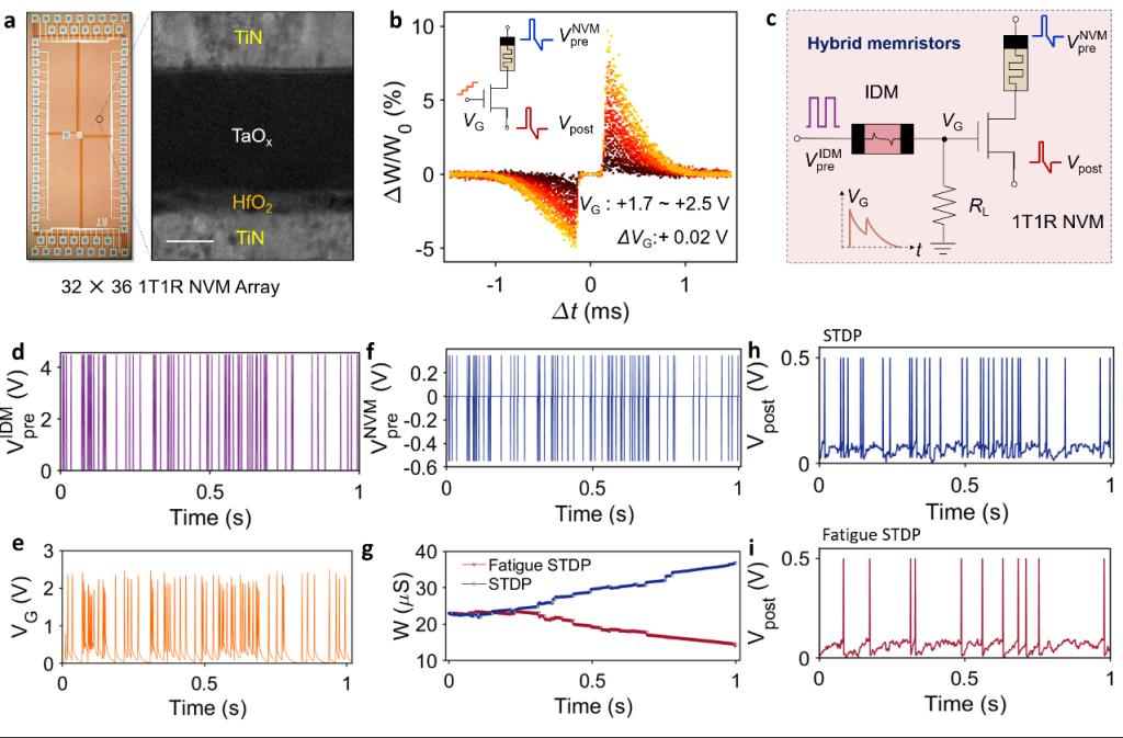 约炮 /广东省存算一体芯片重点实验室杨玉超教授团队在Nature Electronics杂志在线发表了题为Spiking neural networks with fatigue spike-timing-dependent plasticity learning using hybrid memristor arrays的研究论文。研究团队创新性地提出并实现了一种基于界面型易失性忆阻器与非易失性忆阻器栅极耦合的“混合动力学”突触硬件单元,并基于此构建了支持Fatigue STDP(疲劳脉冲时序依赖可塑性)学习规则的脉冲神经网络(SNN)硬件系统。该研究成功攻克了传统类脑计算硬件在复杂高频噪声环境下学习效率低、缺乏频率自适应性的关键科学难题,为构建高能效、高鲁棒性的边缘端类脑智能系统提供了全新的器件基础与架构范式。