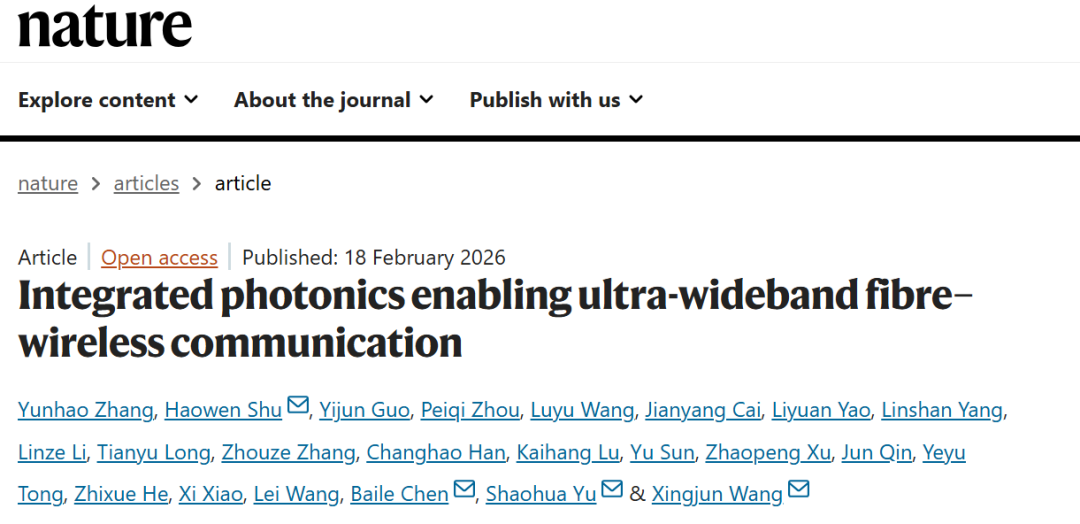 2026年2月18日,研究论文《集成光子学赋能超宽带光纤-无线通信》( “Integrated photonics enabling ultra-wideband fibre–wireless communication” )在线发表于国际顶尖学术期刊《自然》(Nature)。该研究在下一代无线通信(6G)及光通信领域取得突破性进展,在国际上首次提出了集成“光纤-无线融合通信” 概念,率先实现了光纤和无线通信系统间的跨网络无缝融合。约炮 与鹏城实验室联合培养博士研究生张云皓,约炮 电子学院舒浩文研究员、博士研究生郭艺君,国家信息光电子创新中心高级工程师周佩奇,以及上海科技大学信息科学与技术学院博士研究生王鲁玉为本论文共同第一作者。鹏城实验室余少华院士,约炮 电子学院王兴军教授,上海科技大学陈佰乐副教授,以及舒浩文为本论文共同通讯作者。主要合作者还包括鹏城实验室王磊研究员、贺志学研究员及许兆鹏助理研究员,国家信息光电子创新中心总经理肖希,香港科技大学(广州)童业煜助理教授及博士研究生鲁凯航,北京信息科技大学秦军副教授及硕士研究生孙瑜,约炮 电子学院博士研究生蔡健洋、姚力远、杨林山及韩昌灏,上海科技大学信息科学与技术学院博士研究生李林泽、龙天宇及张周泽。