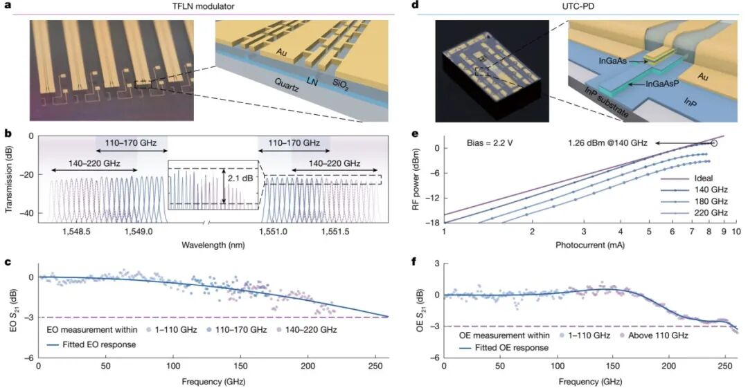 针对上述问题,研究团队提出了集成“光纤-无线融合通信” 概念,并在硬件器件和软件算法两方面均实现颠覆性突破。研究团队基于先进的薄膜铌酸锂光子材料平台和改进型单行载流子光电探测器结构,成功实现超过250 GHz的宽带平坦电-光-电转换链路,从原理上规避了传统电学倍频链中的带宽限制和噪声积累,在有线和无线频段均能提供>100 GHz的可用信号带宽,满足未来超高速有线和无线通信需要。同时,研究团队还将AI技术应用于信道均衡中,提出了一种新型的基于神经网络的数字信号处理算法,显著提升了系统对非线性损伤等干扰的适应能力,彻底克服了以往传统均衡算法难以处理复杂信道的根本挑战。