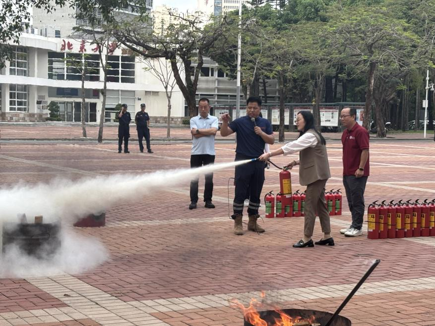在初起火灾扑灭演练环节,李倩老师来到现场进行指导交流。她结合实际案例,强调了提升安全意识和掌握基本应急技能的重要性,并提醒大家在日常学习科研中要时刻绷紧安全这根弦,将规范操作落到实处。